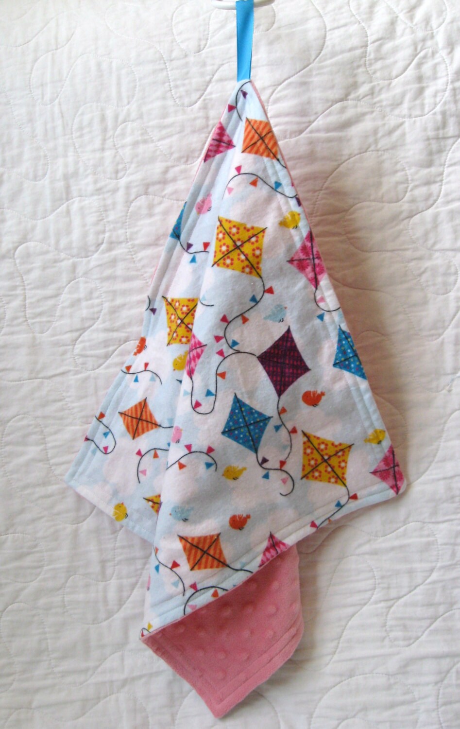 Lovie Security Blanket. Pink Minky and Flying Kites on Flannel. Quiet Toy. Sensory. Baby gift under 20