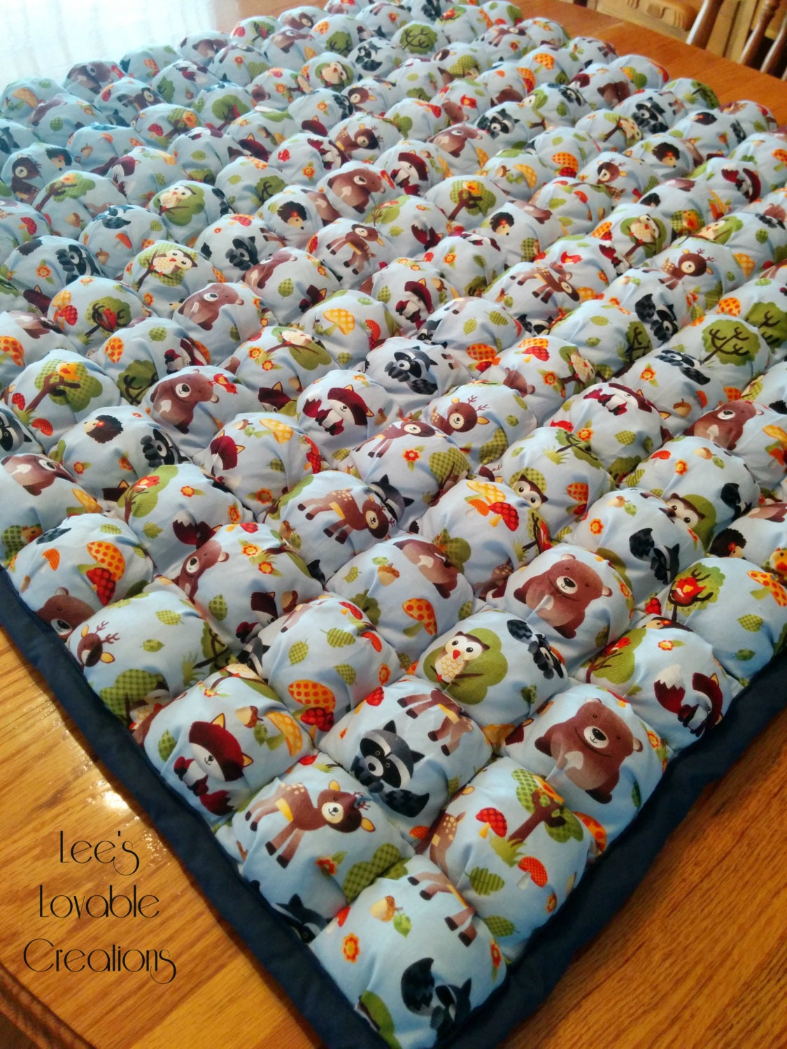 New puff quilt for a baby boy. Light and navy blue, with adorable forest critters.