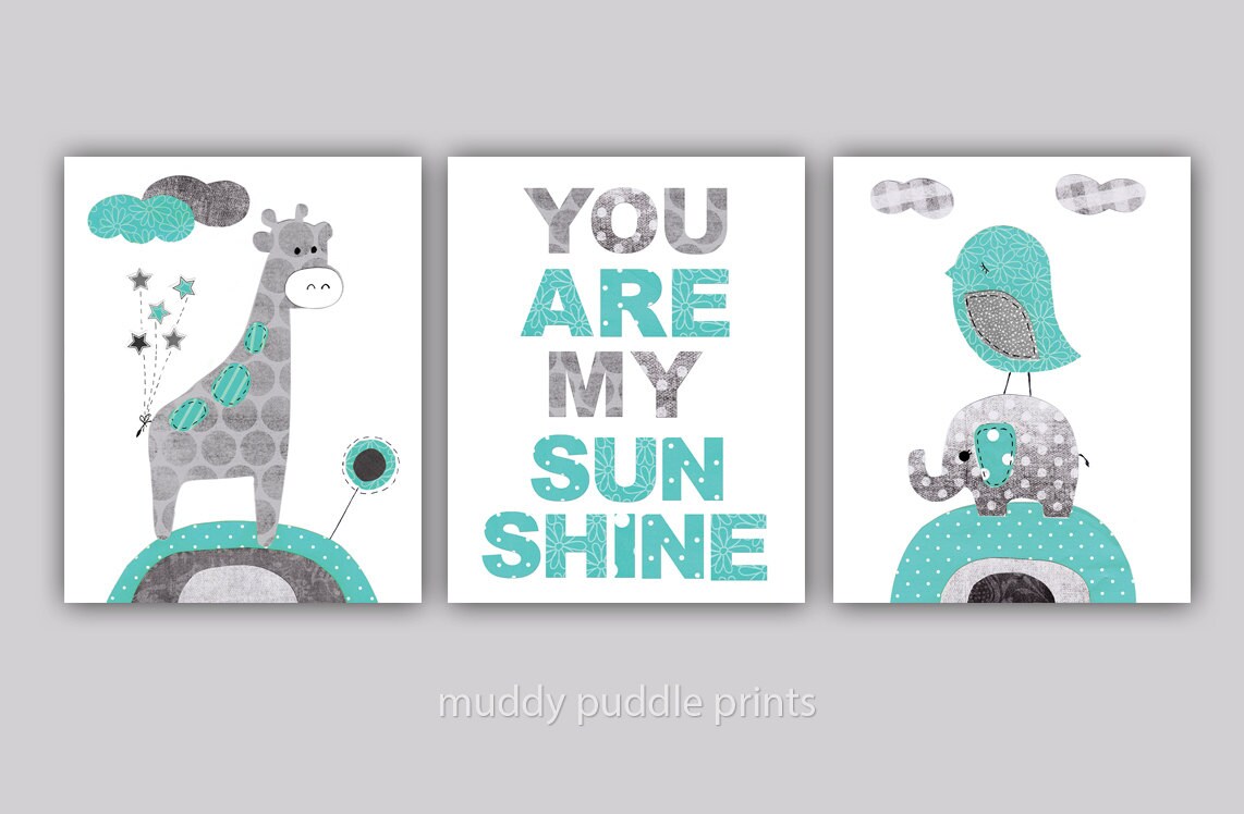 , for sale in Etsy Store MuddyPuddlePrintsNursery art, nursery decor, nursery print, kids room wall art, wall art, sunshine, nursery quote art, teal, turquoise, boys room, grey, Giraffe, Elephant