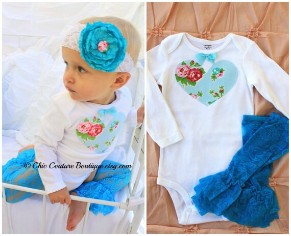 Baby Girl Coming Home Outfit Set of 2 Items. Blue Heart Bodysuit & Lace Ruffle Leg Warmers. Teal, Aqua, Pink, Red. 1st Birthday Outfit. by ChicCoutureBoutique