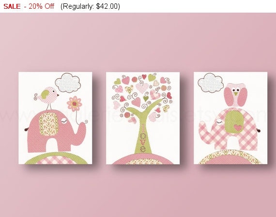 Baby Girl Nursery Decor Art Prints Elephant Nursery Decor Nursery Kids Wall Art Tree Owl Nursery Bird Set of 3 Prints Tree Of Love by GalerieAnais