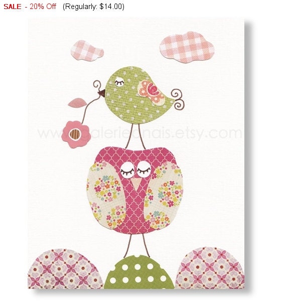 Baby Girl Nursery Decor Bird nursery Owl nursery art kids decor pink and green nursery wall art Kids art Chic And Shabby by GalerieAnais