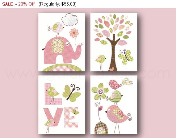 Kids wall Art Butterfly Nursery Art Print Baby Girl Nursery Decor children's art Kids room decor elephant Birds tree love Set of 4 prints by GalerieAnais
