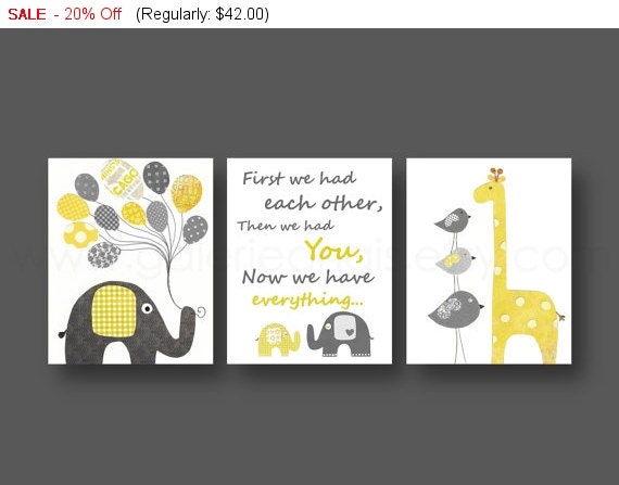 Nursery art print baby nursery decor Kids art yellow gray elephant giraffe bird First we had each other Set of three prints by GalerieAnais