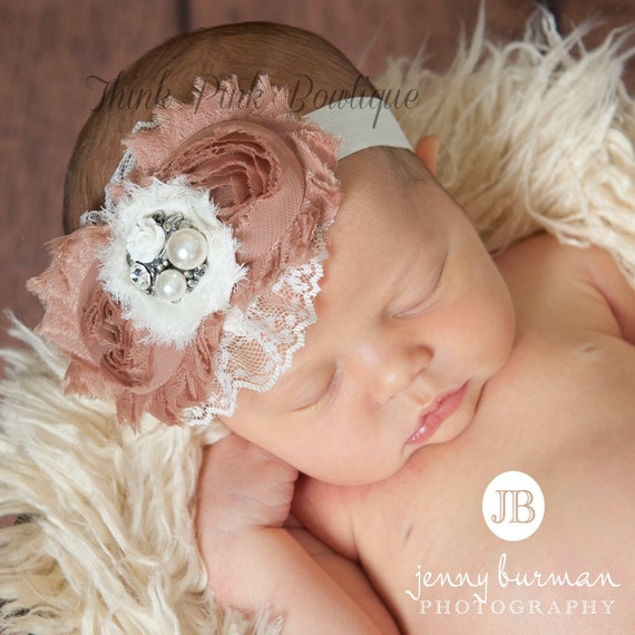 Baby headband, Baby Headbands, Newborn Headband,Christening headband,shabby chic headband, Baptism headband, Lace Headband, Baby hair Bows. by ThinkPinkBows