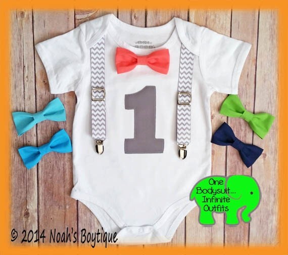 Boys First Birthday Outfit - Grey Chevron - Birthday Shirt - Suspenders Bow Tie - 1st Birthday - Birthday Clothes - Navy - Lime - Coral by NoahsBoytiques