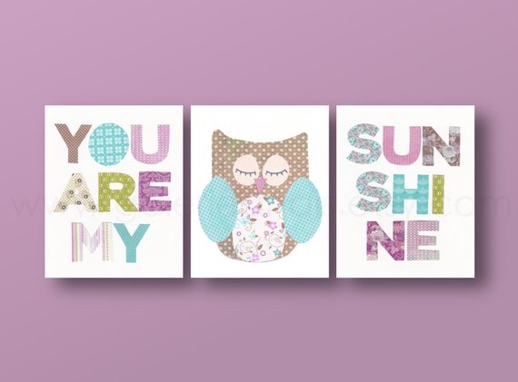Children art baby nursery decor- nursery art decor- Kids art- kids decor- bird- owl- words- Set of 3 Prints - You Are My Sunshine by GalerieAnais