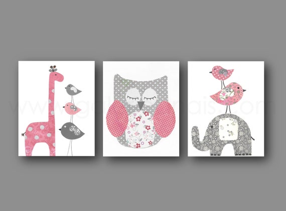 Gray and Pink nursery - giraffe elephant Birds Owl children wall art - personalized kids decor - baby girl - Set of three prints by GalerieAnais