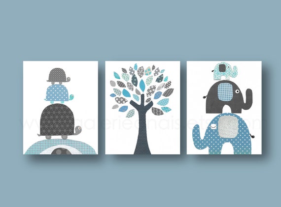 Turtle elephant tree Nursery wall art nursery print baby nursery kids art children wall art blue gray Set of three prints by GalerieAnais