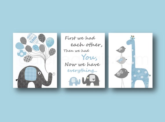 Baby boy nursery decor Elephant Nursery art First we had each other Quote blue gray nursery giraffe nursery Bird Kids Art Set of 3 prints by GalerieAnais