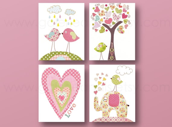 Baby Girl Nursery Decor Nursery Prints Baby Nursery Prints Kids art Tree Elephant Birds Heart Love Set of 4 prints by GalerieAnais