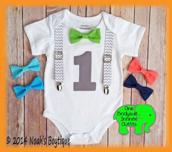 Boys First Birthday Outfit - Grey Chevron - Birthday Shirt - Suspenders Bow Tie - 1st Birthday - Birthday Clothes - Navy - Lime - Aqua by NoahsBoytiques