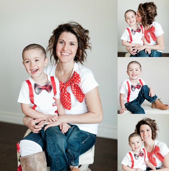 Christmas Holiday Baby Boy to Youth Boy Bow Tie and Suspenders T-shirt Tee. Red Black Cream Plaid, Wedding, 1st First Birthday, Thanksgiving by ChicCoutureBoutique