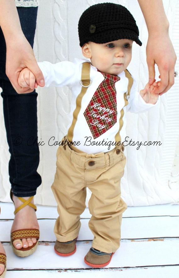 Tie and Suspenders Baby Boy "Happy Turkey Day" or ANY Wording Bodysuit. 1st Thanksgiving, Autumn. Hounds tooth, Plaid, 1st Birthday Shirt by ChicCoutureBoutique