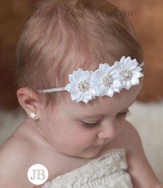 White Baby Headband, Baptism Headband, Christening Headband, Baby headbands, Flower Headband, Baby Hair Bows, Baby Girl Headband, Baby Bows. by ThinkPinkBows